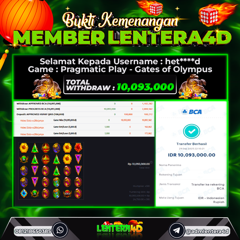 Setiap hari, member Lentera4D berhasil meraih jackpot besar dari berbagai provider slot ternama yang kami sediakan, seperti Pragmatic Play, Habanero, PG Soft, dan masih banyak lagi. Kami secara rutin menampilkan bukti screenshot atau rekapan kemenangan yang berhasil diraih, mulai dari kemenangan ratusan ribu hingga puluhan juta rupiah. Semua slip kemenangan ini kami hadirkan untuk membuktikan bahwa di Lentera4D, peluang menang itu nyata.