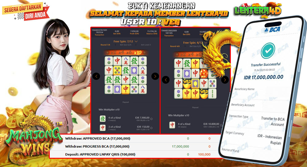 Setiap hari, member Lentera4D berhasil meraih jackpot besar dari berbagai provider slot ternama yang kami sediakan, seperti Pragmatic Play, Habanero, PG Soft, dan masih banyak lagi. Kami secara rutin menampilkan bukti screenshot atau rekapan kemenangan yang berhasil diraih, mulai dari kemenangan ratusan ribu hingga puluhan juta rupiah. Semua slip kemenangan ini kami hadirkan untuk membuktikan bahwa di Lentera4D, peluang menang itu nyata.